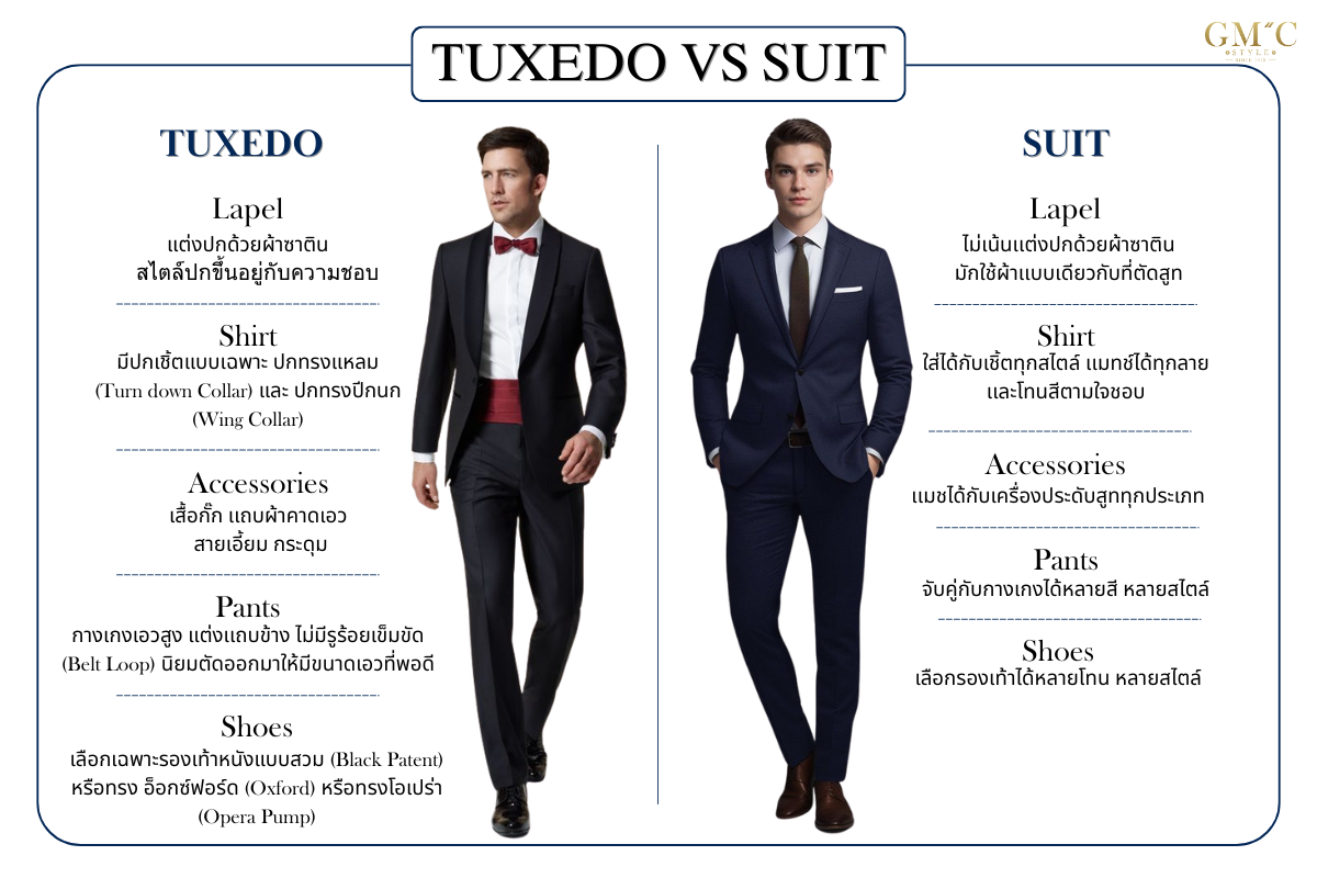 - เครื่องประดับ: มักใส่กับโบว์ไท (bow tie), เสื้อเชิ้ตแบบมีจีบหรือผ้าซาติน, รองเท้าเงา (patent shoes)